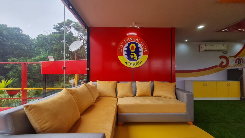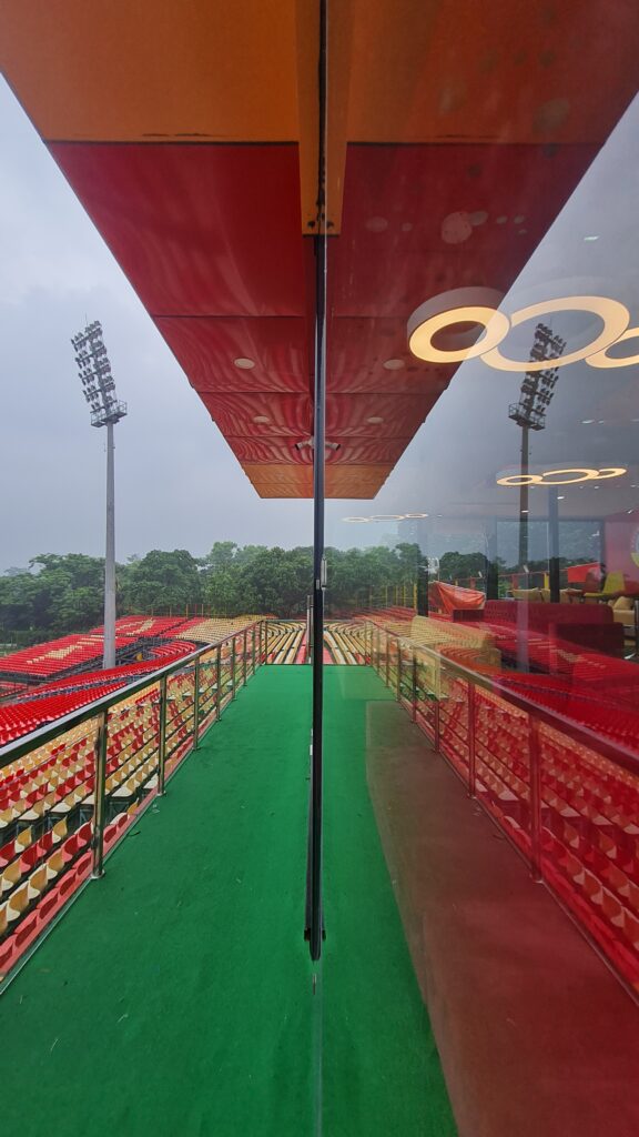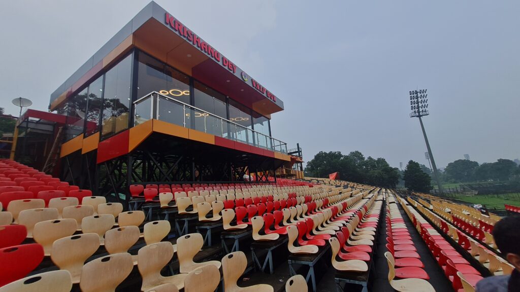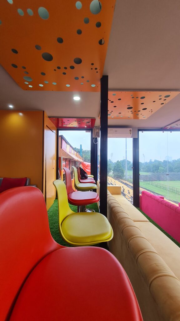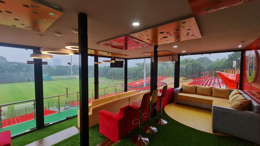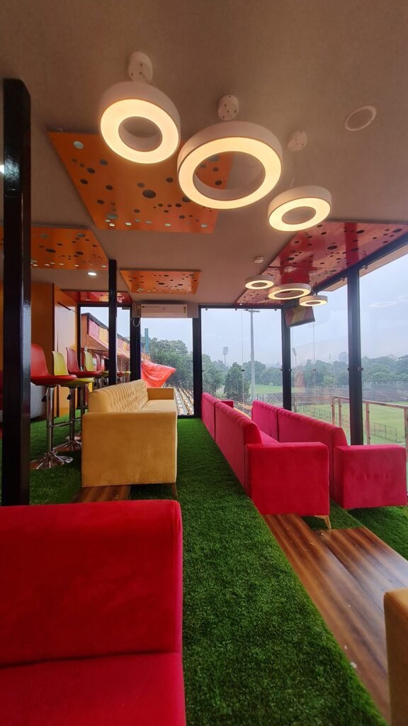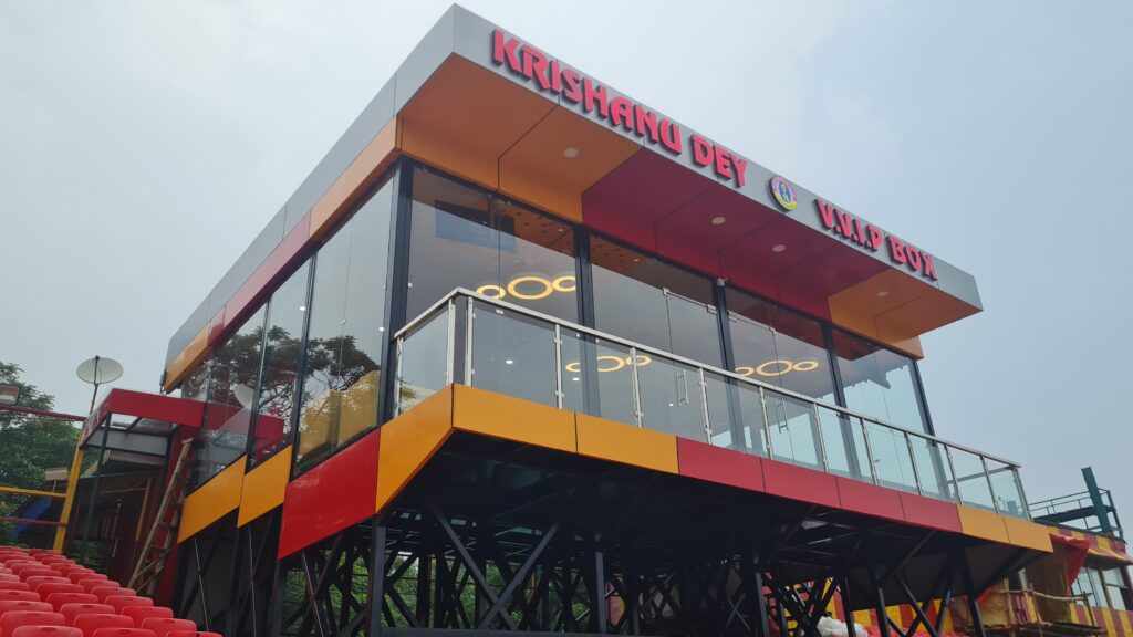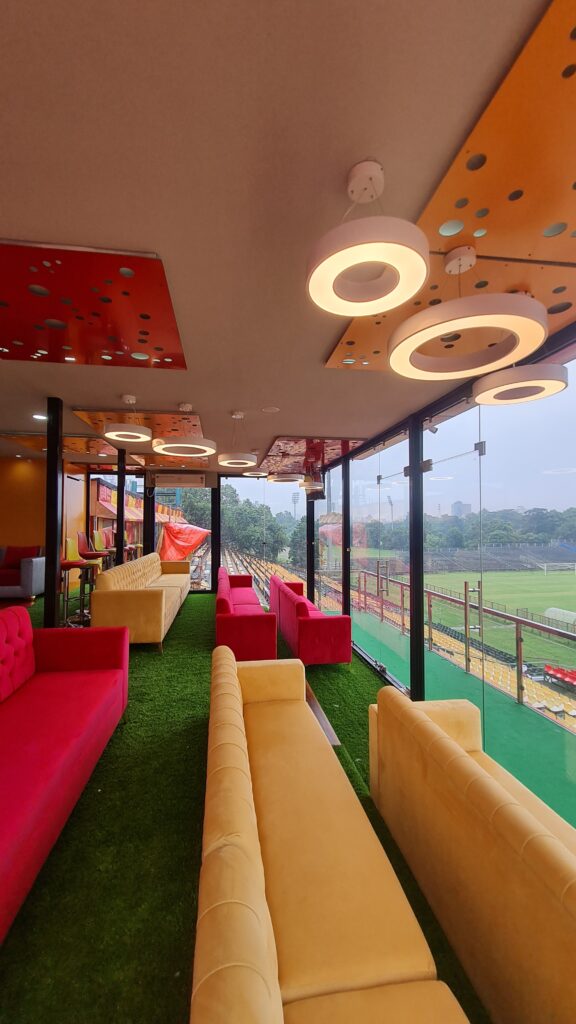The East Bengal Club V.I.P. Box at Eden Gardens, Kolkata, is a vibrant and modern viewing space designed for premium spectator experience. Elevated on a sleek steel framework, the glass-clad structure features bold red and yellow accents reflecting the club’s identity. The interior offers plush seating, ambient lighting, air-conditioning, and a panoramic view of the field through full-height glass walls. Stylish ceiling panels and a well-equipped hospitality area create a luxurious and welcoming atmosphere. Dedicated to football legend Krishanu Dey, the V.I.P. box seamlessly blends club heritage with contemporary design, enhancing both comfort and exclusivity for East Bengal Club’s elite guests.