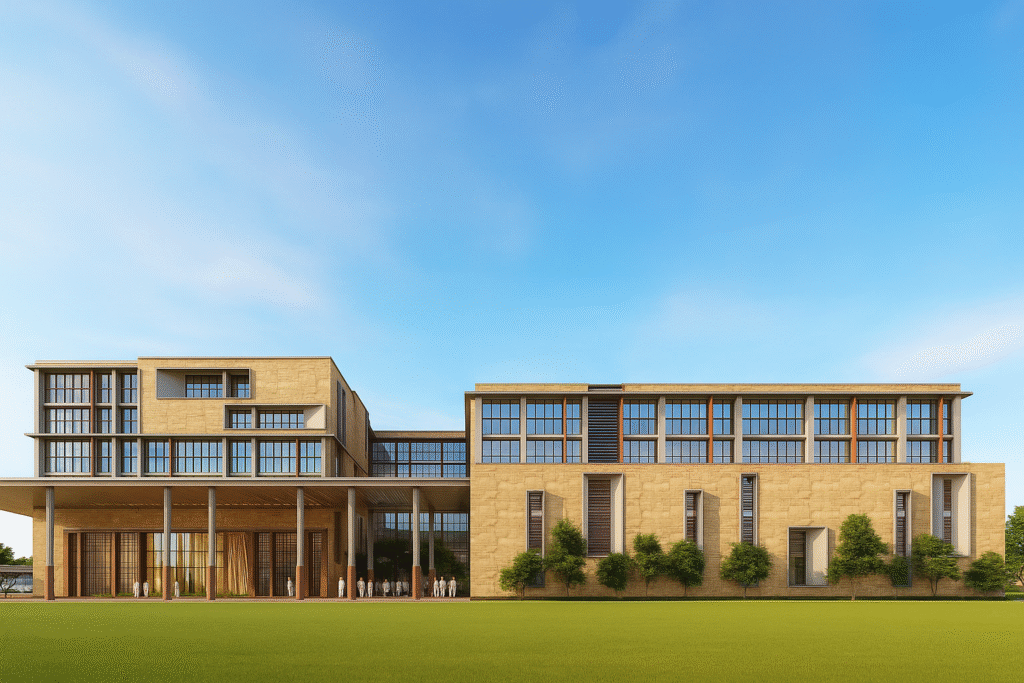 The architectural design of Santiniketan Medical College in Santiniketan, West Bengal, showcases a modern and functional hospital campus set in a serene environment. The buildings feature clean lines, extensive use of glass for natural lighting, and textured stone façades for warmth and durability. The central courtyard and landscaped areas create a calming atmosphere, fostering healing and interaction. Tall colonnades and open walkways enhance accessibility, while wide entrances welcome patients and visitors. The overall layout promotes efficiency, comfort, and sustainability, blending contemporary design with thoughtful spatial planning to support both medical functionality and human well-being.